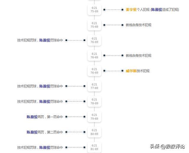陈盈骏获得三次技术犯规+2次罚球,5罚全中,北京这一段混乱的回合得到5分。