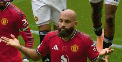 姆贝莫摊开双手庆祝,眼神犀利,看上去非常霸气。曼联队长B费,笑着拍打姆贝莫的大光头庆祝。
