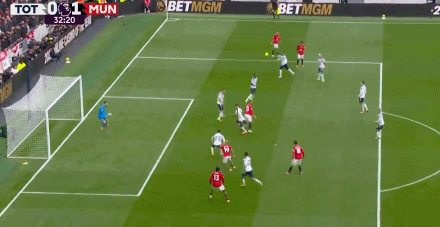 整个上半场比赛,双方机会寥寥,不仅进攻端严重受阻,在中场的传球也多次出现了失误;热刺3次射门全部偏出了球门。曼联前20分钟没有制造出一次射门机会;不过上半场还是产生了一粒点球。第32分钟,范德芬禁区内解围却一脚闷在了B费脸上,库尼亚组织二次进攻机会,迪亚洛右路观察后选择传中,姆伯莫原地跳起甩头攻门得手,1:0!不得不说姆伯莫对热刺还是十分有心得,生涯8次在联赛中与热刺交手,贡献了5球1助攻。