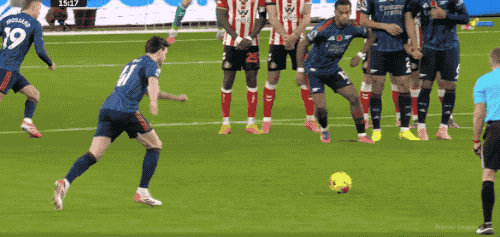 第15分钟,加布里埃尔为枪手赢得前场任意球,赖斯的射门绕过人墙,力量十足但球速不算太快,门将将球击出。