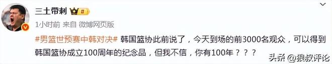对于100周年的历史,是否存在虚高的成分,媒体人“三土带刺”发文质疑:“韩国篮协此前说了,今天到场的前3000名观众,可以得到韩国篮协成立100周年的纪念品,但我不信,你有100年???”